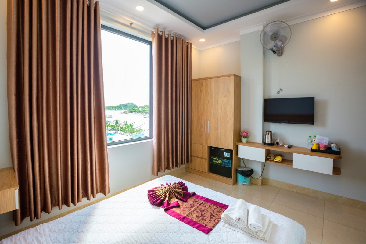 Điểm nhất tại mỗi căn phòng của hạng phòng Superior công viên và làng chài tại khách sạn Châu Gia là mỗi sáng thức dậy hay về chiều khi hoàng hôn dần chìm sau dãy núi. Đó là góc view cửa sổ có thể phóng tầm mắt ngắm nhìn cuộc sống cảnh vật xung quanh của người dân làng chài nơi vùng vịnh.